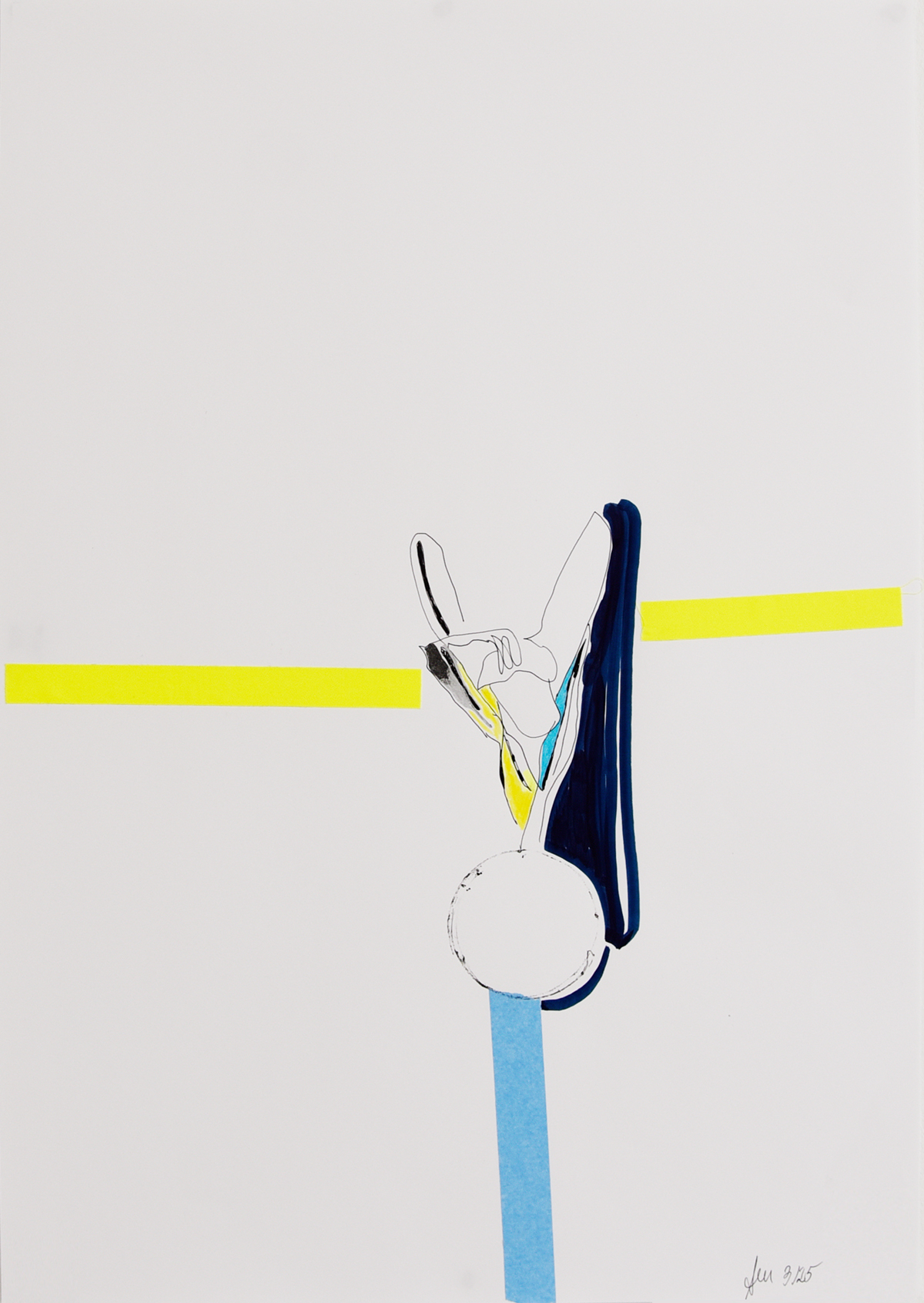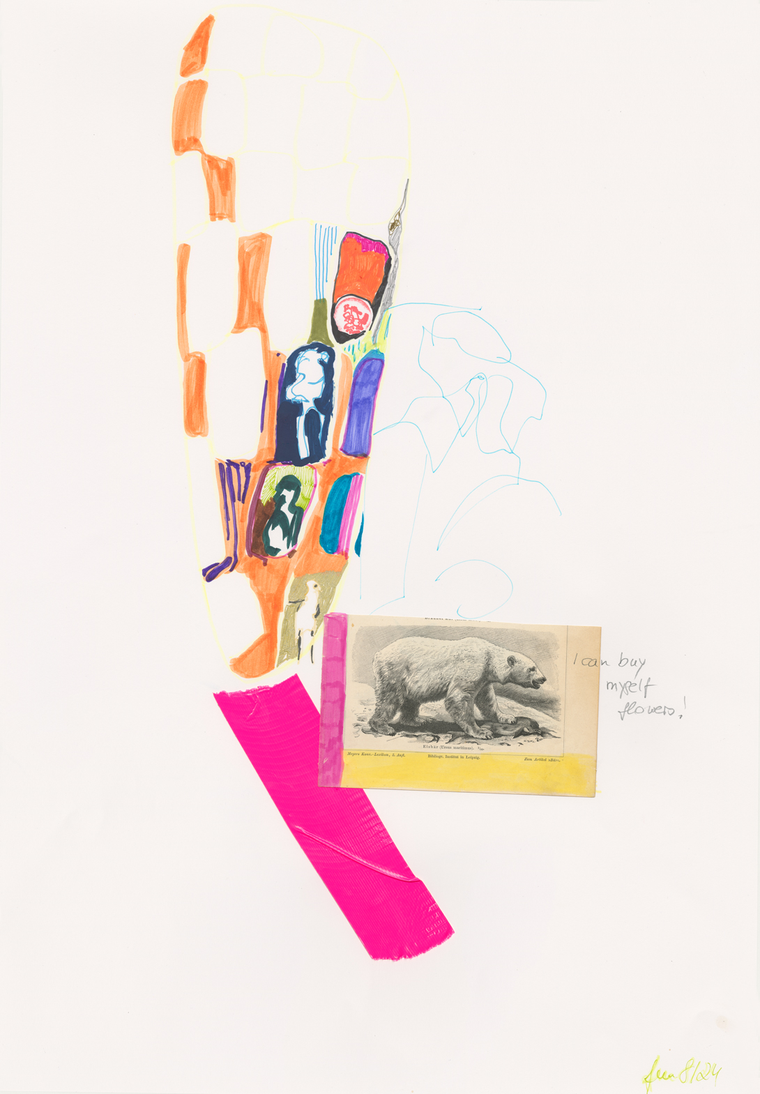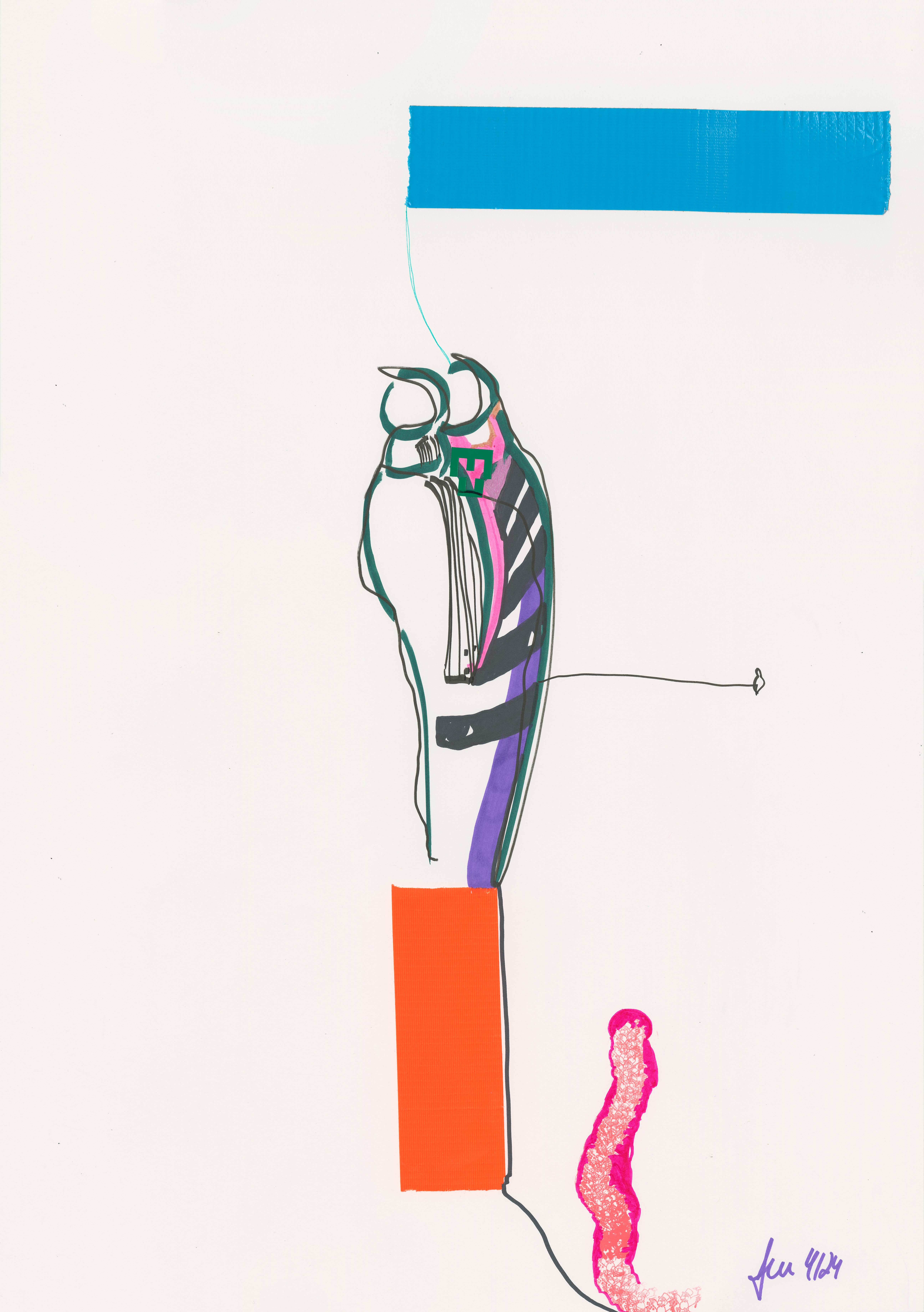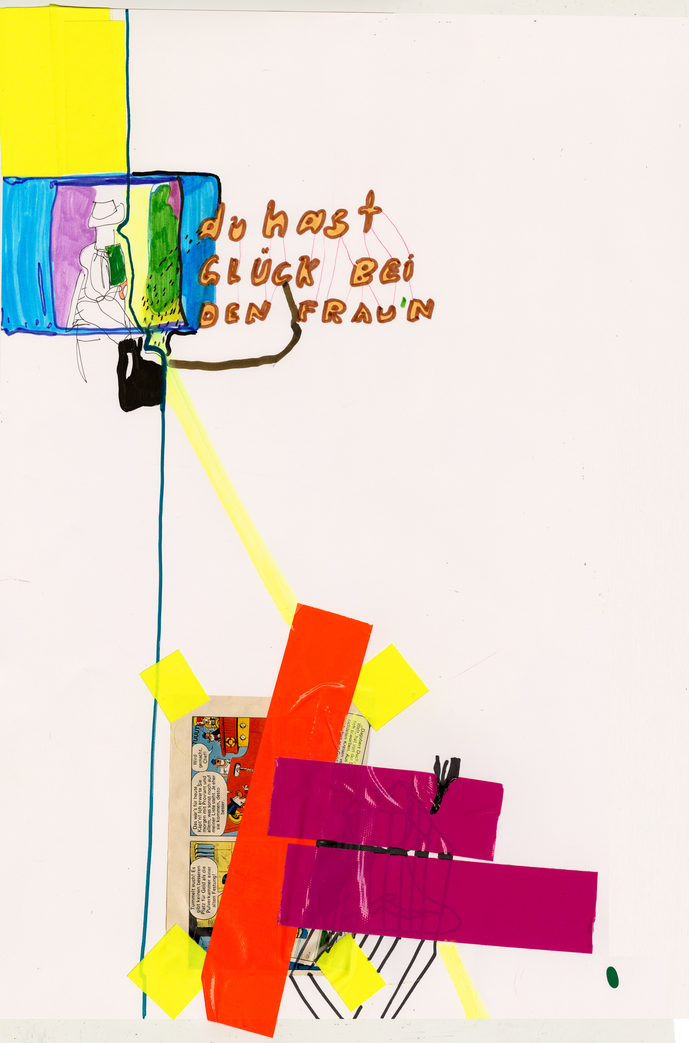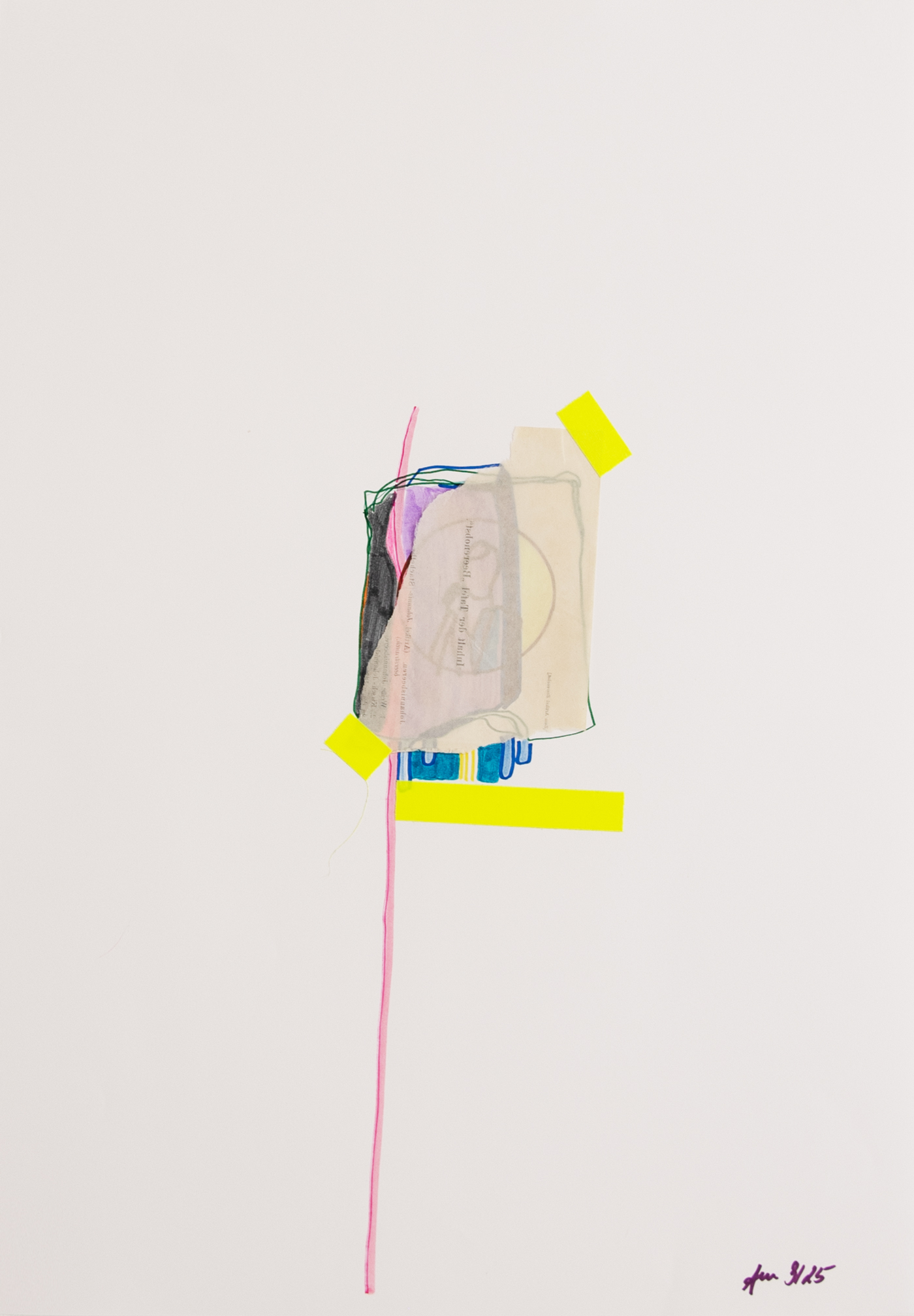 Tatsächlich zeichnet und collagiert Franza Maier teilweise mit streng geometrischen Formen, Schablonen, hart am Lineal gezogenen Linien oder Klebebändern. Ihre Form- und Farbensprache ist aber derart variabel, dass von einem Schema keine Rede sein kann.