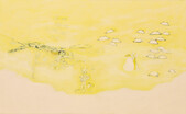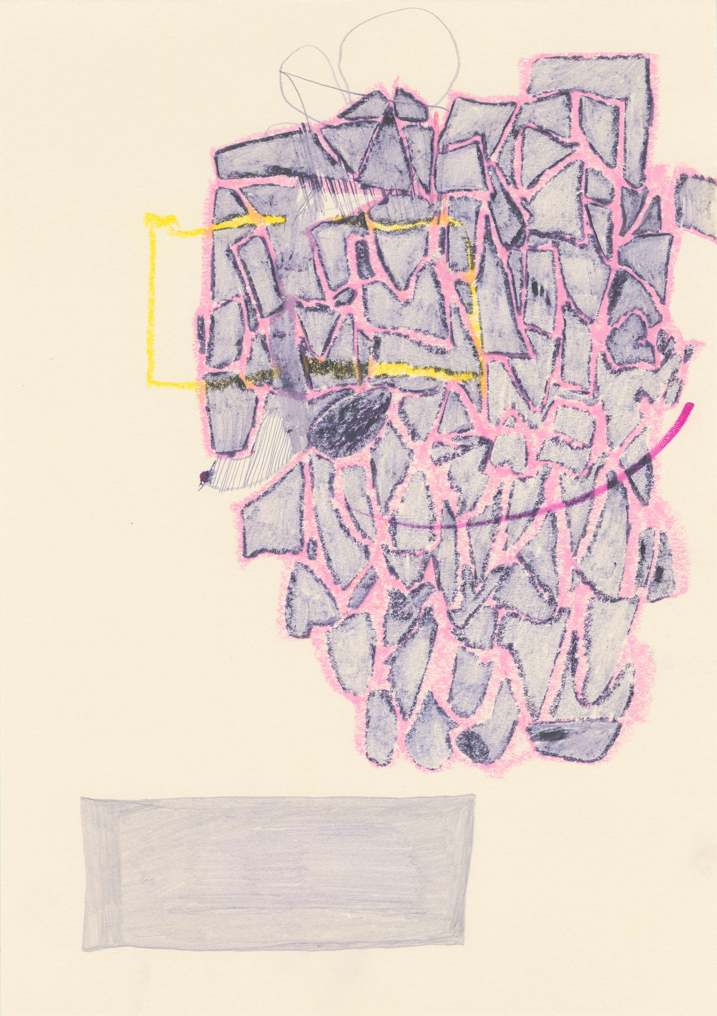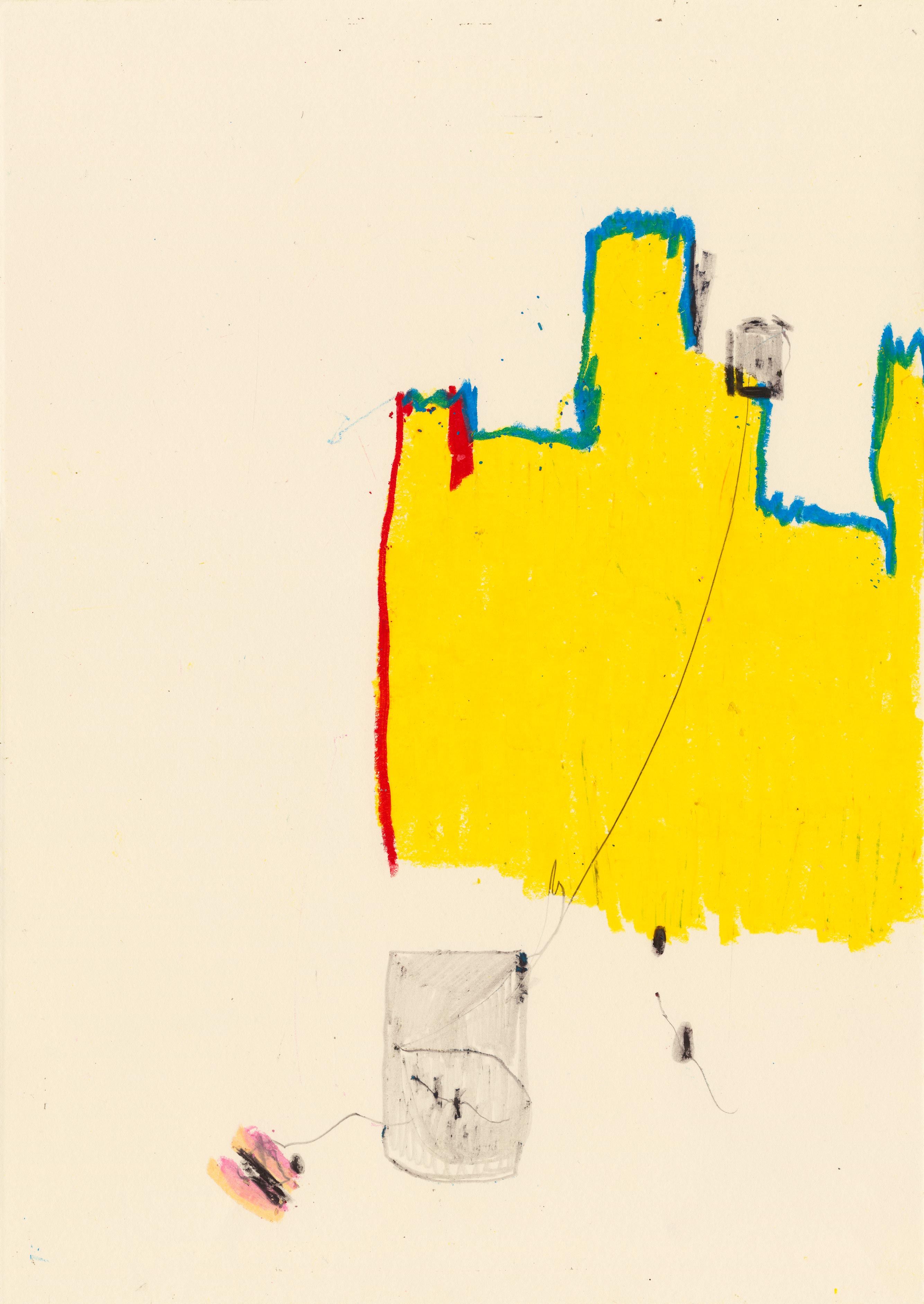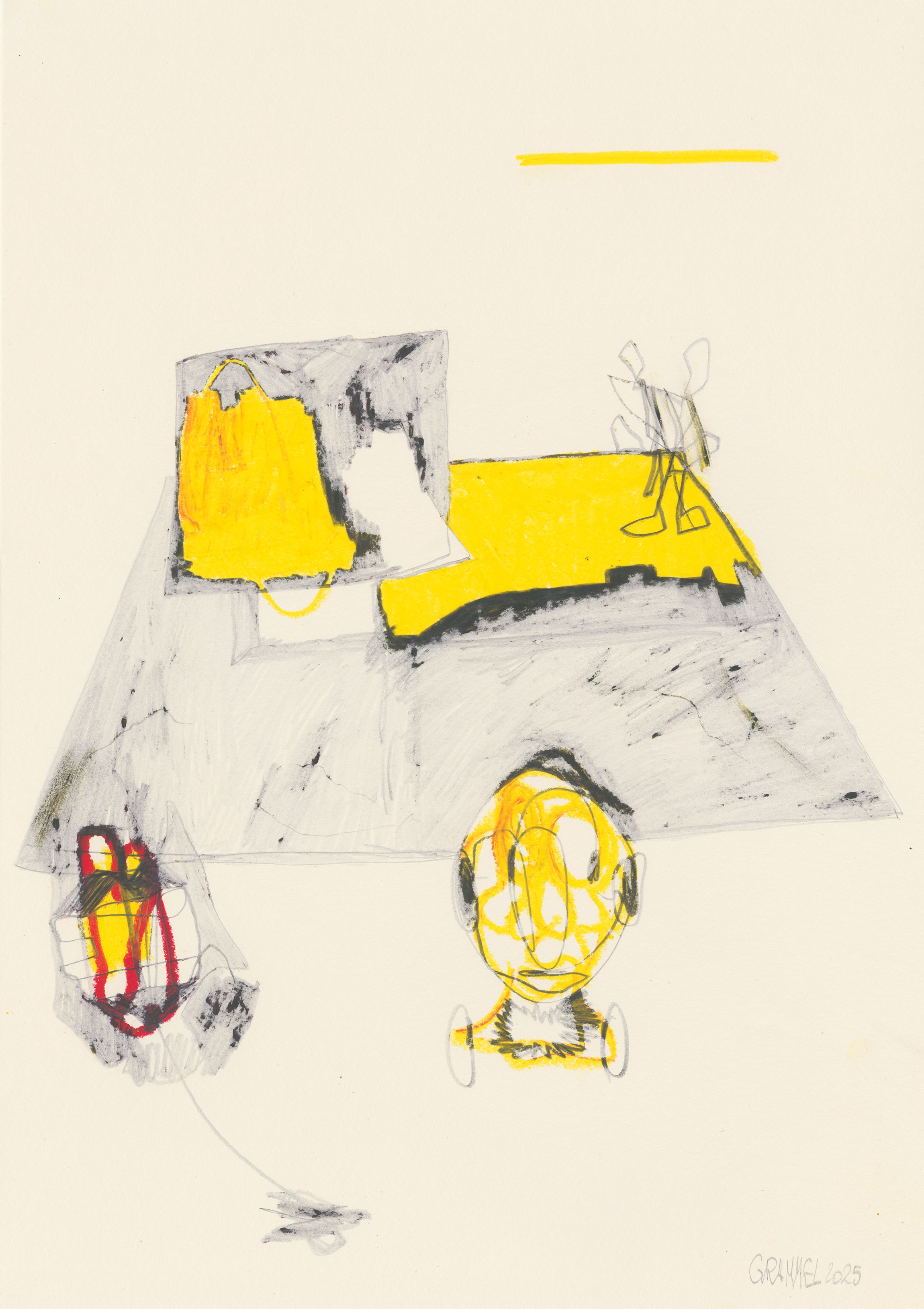 In vielen Zeichnungen fallen die sorgsam patinierten, brüchigen Oberflächen und das violett-metallische Schimmern des Kopierstiftes auf. Diese Formen setzt er in harten Kontrast zum neutralen Weiß des Papiers, oder zu tiefgelben, weitgehend homogenen Farbschichten, deren Ölkreiden-Duktus erst bei näherer Betrachtung sichtbar wird. Durch den wechselnden Einsatz von Kopierstift und Ölkreide schafft Grammel scharfe Grenzverläufe und Oberflächen von so unterschiedlicher Textur, dass die Gebilde wie geschnittene Versatzstücke einer Collage erscheinen.