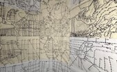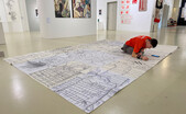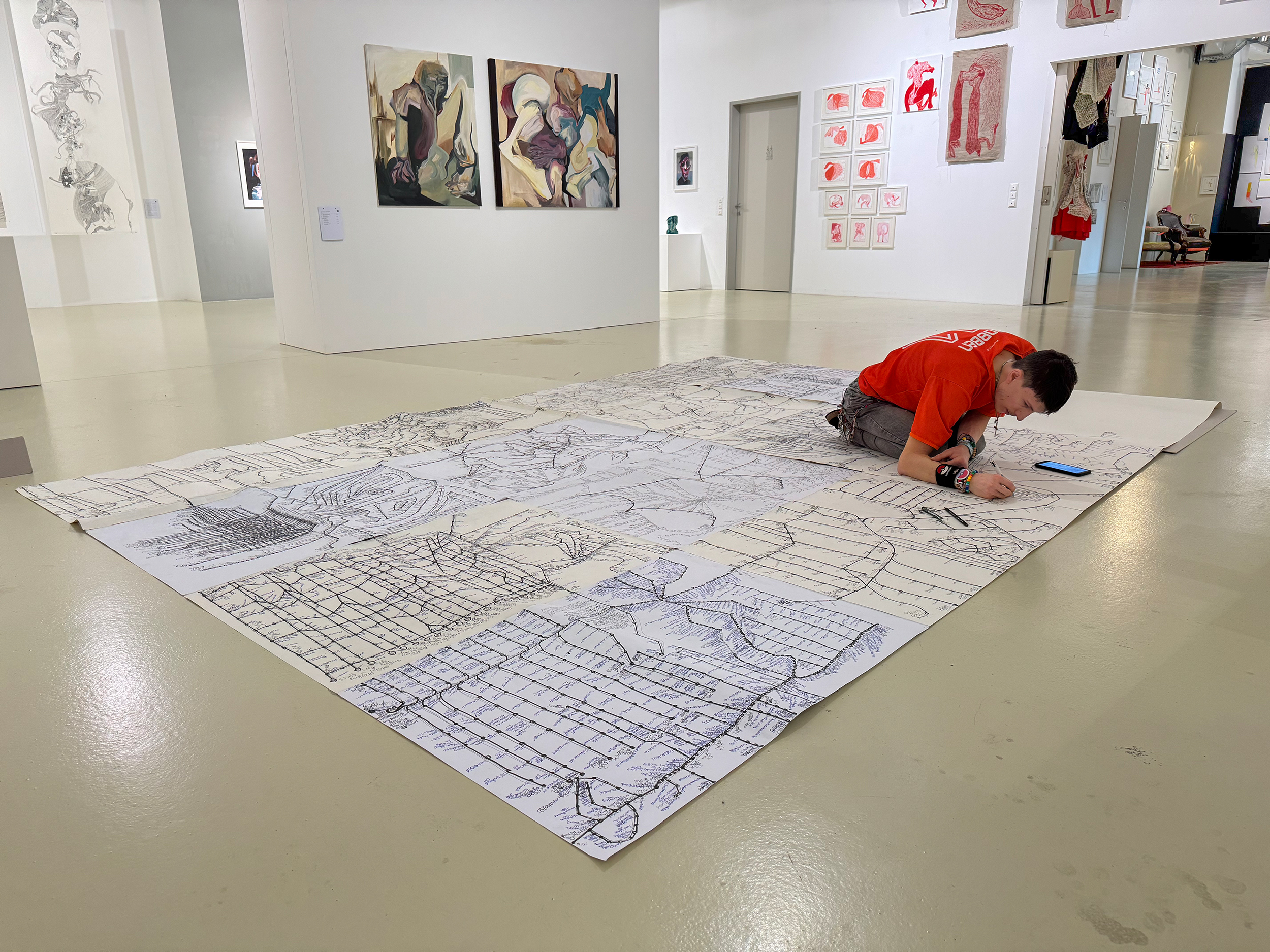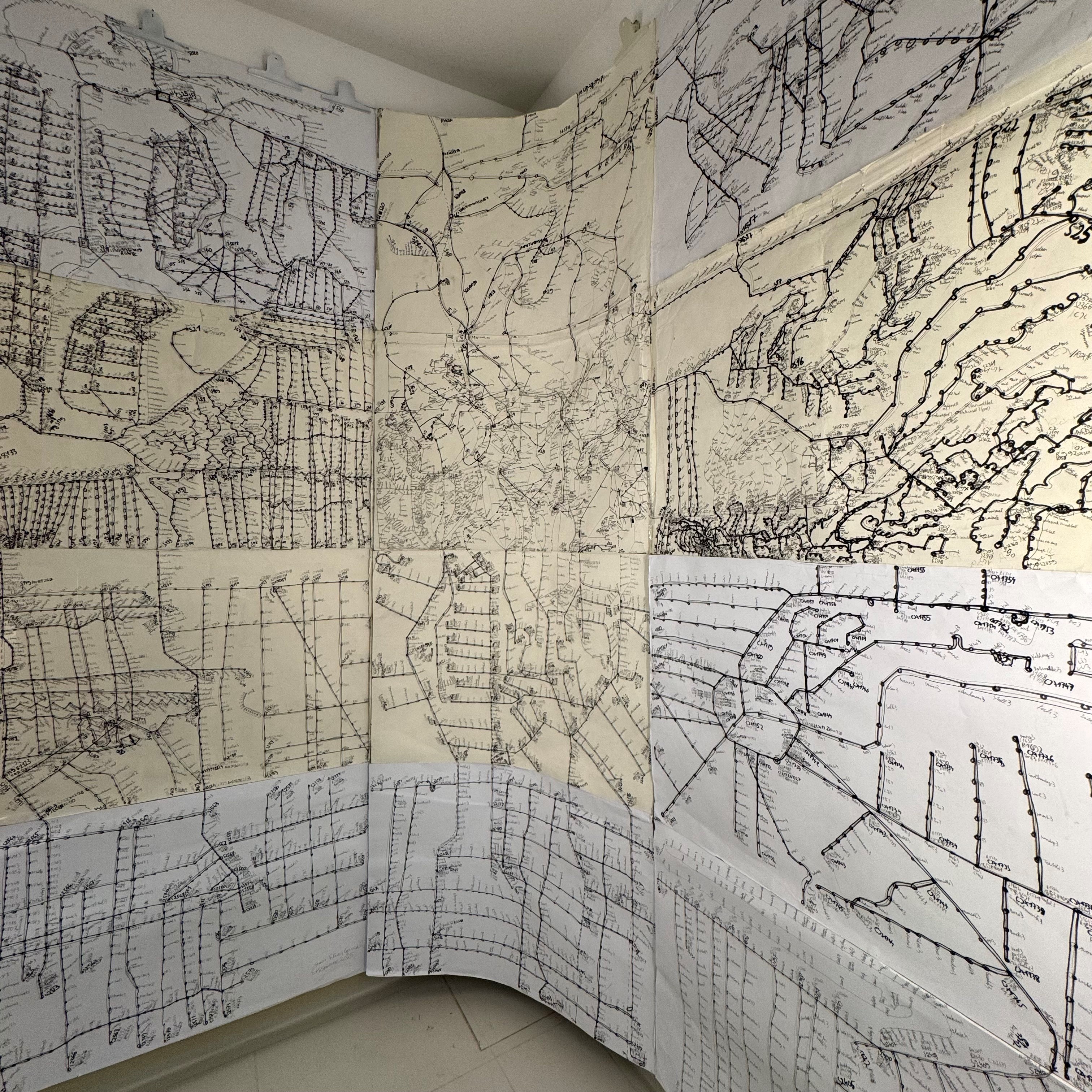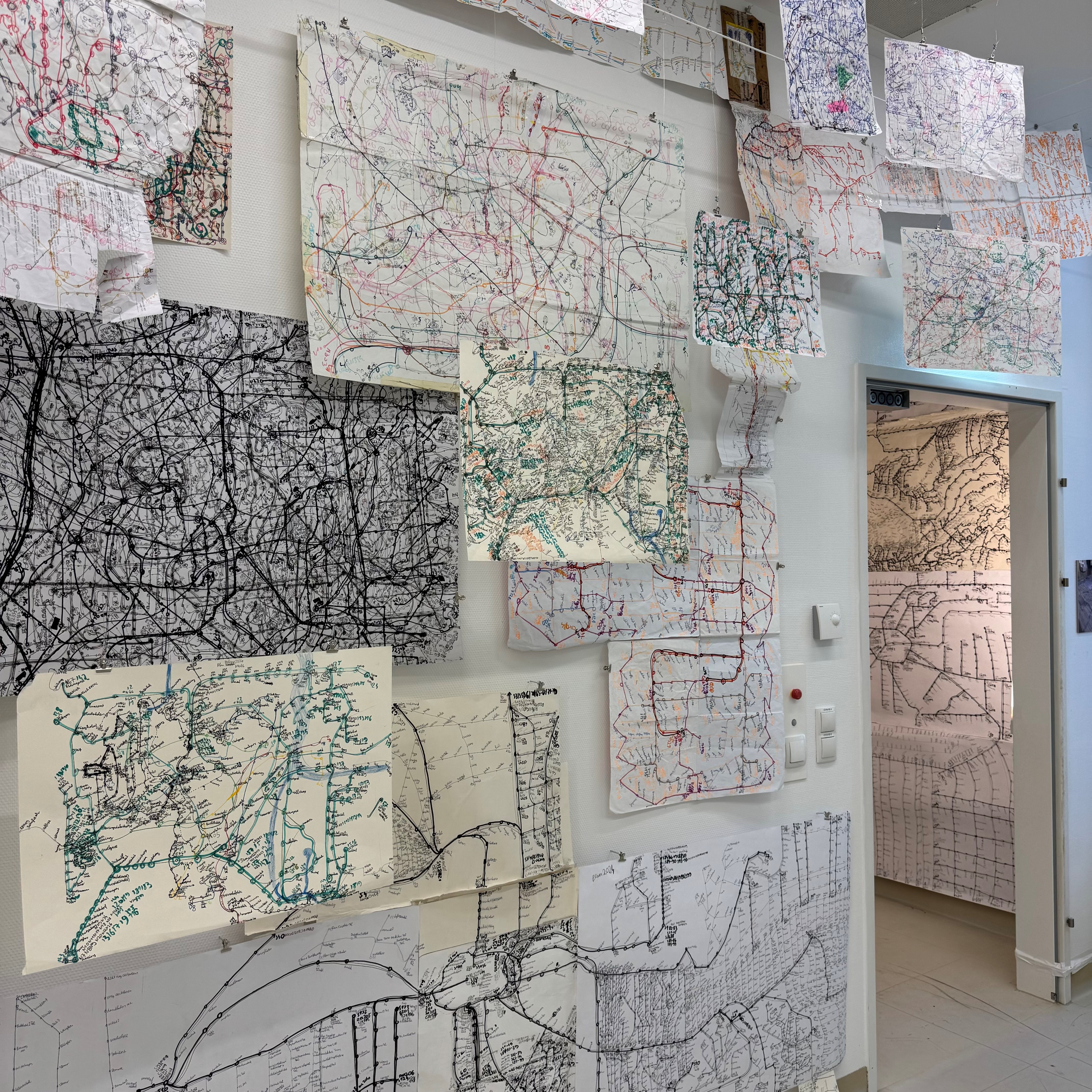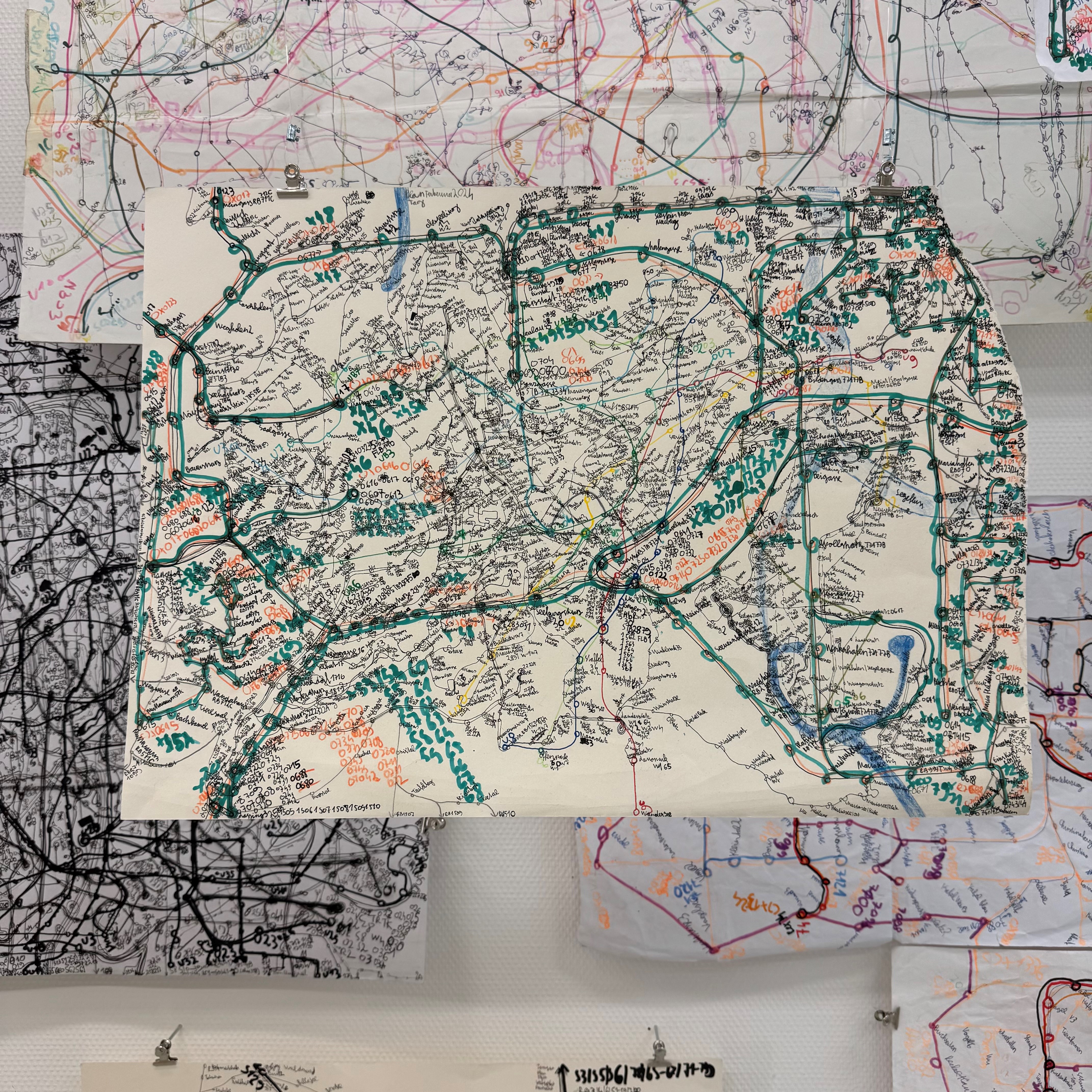 Elias Griedls zeichnerische Netzwerke wirken zunächst überfrachtet – angereichert mit Ordnungssystemen, Linien, Kreuzungen, Symbolen, Zahlen und Schriften. Sie erinnern sofort an das Geflecht von Fahr- oder Straßenplänen. Und tatsächlich ist Griedls profundes Interesse an öffentlichen Transportmitteln, dem Nahverkehr und den ihnen zugrundeliegenden Orientierungskarten die Basis seiner Grafiken. Griedl ist fasziniert von der Komplexität, der Ordnung und Schlüssigkeit der Systeme, und kreiert eigene, von Bahn- und Buslinien zerfurchte Landschaften.