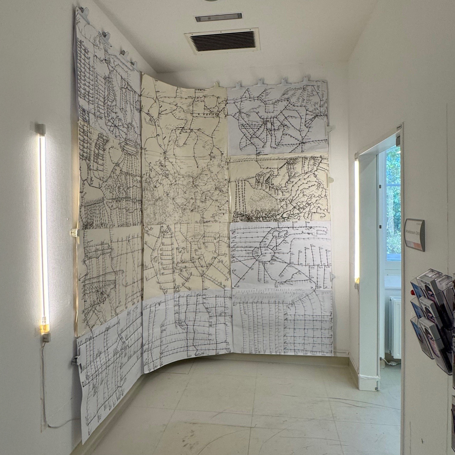 Mit der Patina einer viel zu oft und hastig verwendeten Orientierungshilfe arbeitet Elias Griedl aber nicht nur gegen die Gewohnheit sauber gefalteter Lesbarkeit – auch als Artefakte, als Kunstwerke bilden sie eine Herausforderung. Griedl zeichnet u. a. mit Kugelschreiber und Filzstiften auf unterschiedlichen Papieren und verbindet sie mit Klebeband. Seine Werke haben oft unregelmäßig verlaufende Außenmaße und die verwendeten Materialien sind sehr lichtempfindlich. Griedl entzieht sich auch hier den Konventionen, da sich viele seiner Arbeiten durch Umwelteinflüsse verändern werden und längst nicht alle von ihnen in normierte Bilderrahmen passen.