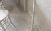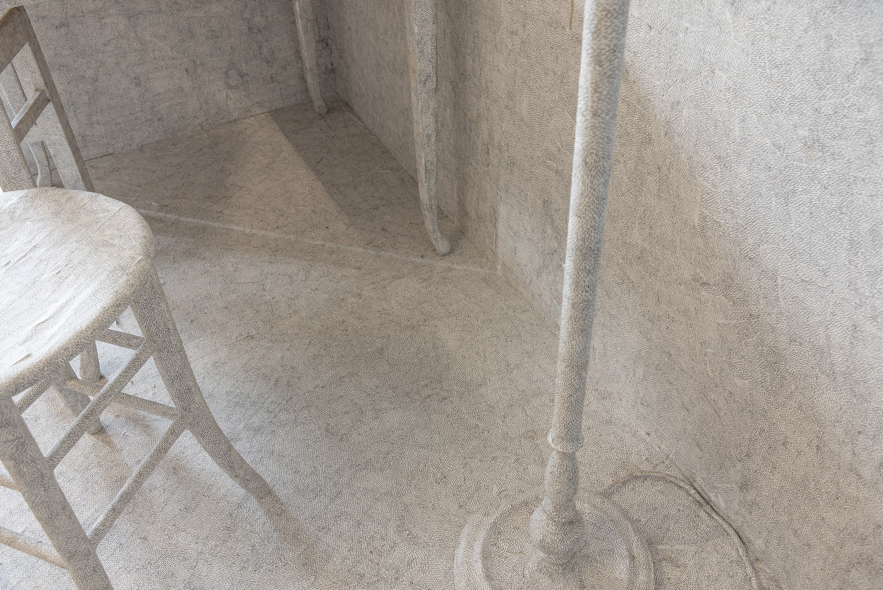 Für ein nächstes Projekt bearbeitete Hering einen kleinen Raum im Atelier 10 über mehrere Wochen. Für diese Raumgestaltung verwendete sie blaues, dünnes Vinyl-Klebeband, das sie stückelte und in variablen, unterschiedlich getakteten Struktur-Schwärmen zusammensetzte.