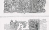 Raubritter und Nazischergen, Jesus am Kreuz, Psychiater, Sex- und Hinrichtungsszenen, historische Gestalten und anonyme, maskenhafte Gesichter. Dazwischen vereinzelte Architekturschnipsel oder ganze Stadtansichten, technisch detaillierte Wiedergaben von Maschinen, grob konturierte Wortfetzen, feine Inschriftierungen und ganze Textblöcke – gebunden durch eine Textur winziger Partikel, Haken, Würmer und Alltagsgegenstände in mikrobischer Dichte und Ausbreitung.